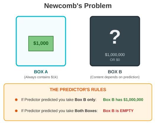 You have to select between two boxes. One contains 1000$. You do not know the content of the other box. You have to select to take either only this other box or both boxes. Now, the story goes on to invent a super-device who will put 1’000’000$ into the other box, if it predicts that you pick only that one box, and leave it empty if you pick both. They tell you that this super-device has successfully predicted „almost each“ choice of candidates so far.